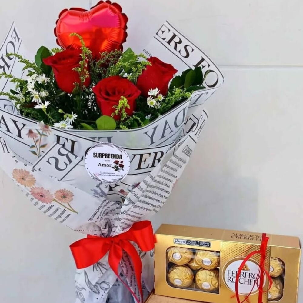 Descubra a beleza única deste buquê, delicadamente composto por 3 rosas deslumbrantes, proporcionando um toque de romantismo e elegância. Adicionado a isto, uma folhagem vibrante que adiciona um contraste perfeito de cor. Embrulhado com cuidado em um exclusivo papel jornal, o buquê é finalizado com um laço de cetim, adicionando uma sensação extra de luxo e delicadeza. Surpreenda ainda mais com um mini balão incluído, que adiciona um toque festivo ao conjunto. E como forma de expressar sua doçura e afeição, este conjunto inclui uma deliciosa caixa de Ferrero Rocher com 8 unidades. Ideal para criar momentos inesquecíveis e especiais.