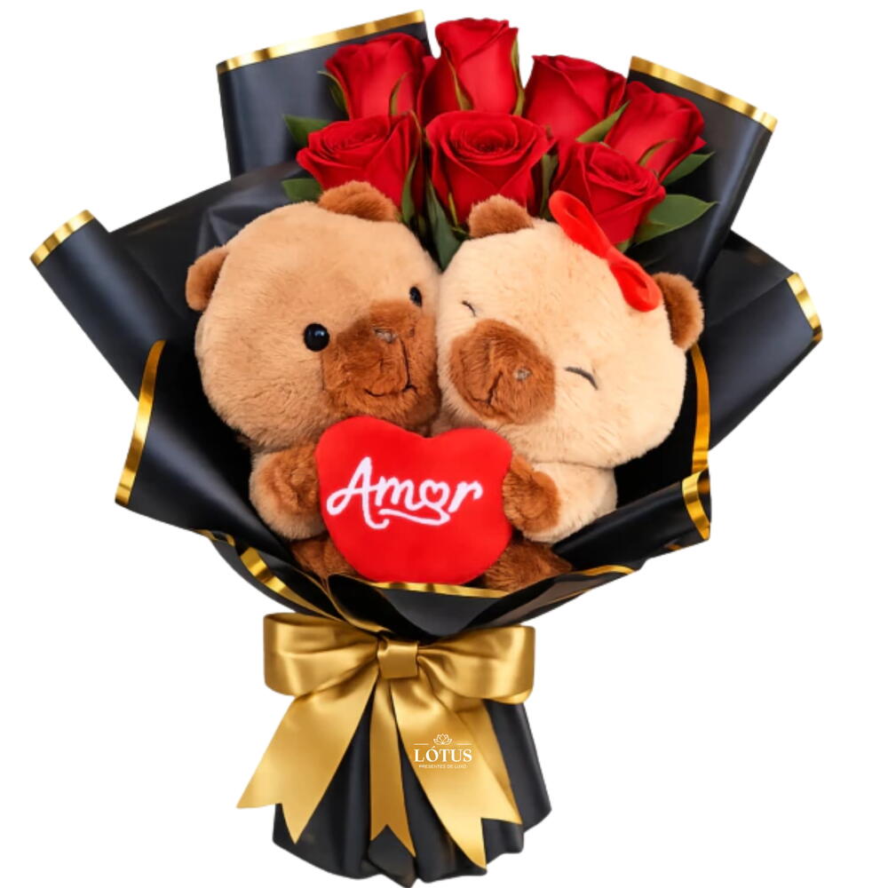 ENCANTE, SURPREENDA, EMOCIONE, COM: Buquê romântico com 7 rosas vermelhas e pelúcia de capivara apaixonada, a combinação perfeita para declarar amor. ITENS QUE COMPÕEM O SEU PRESENTE 7 rosas vermelhas frescas 1 pelúcia de capivara com coração “Amor”