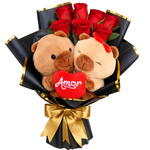 embalagem - 1 un. laço - 1 un. rosa vermelhas frescas - 7 un. pelúcia de capivara com coração “amor” - 1 un.