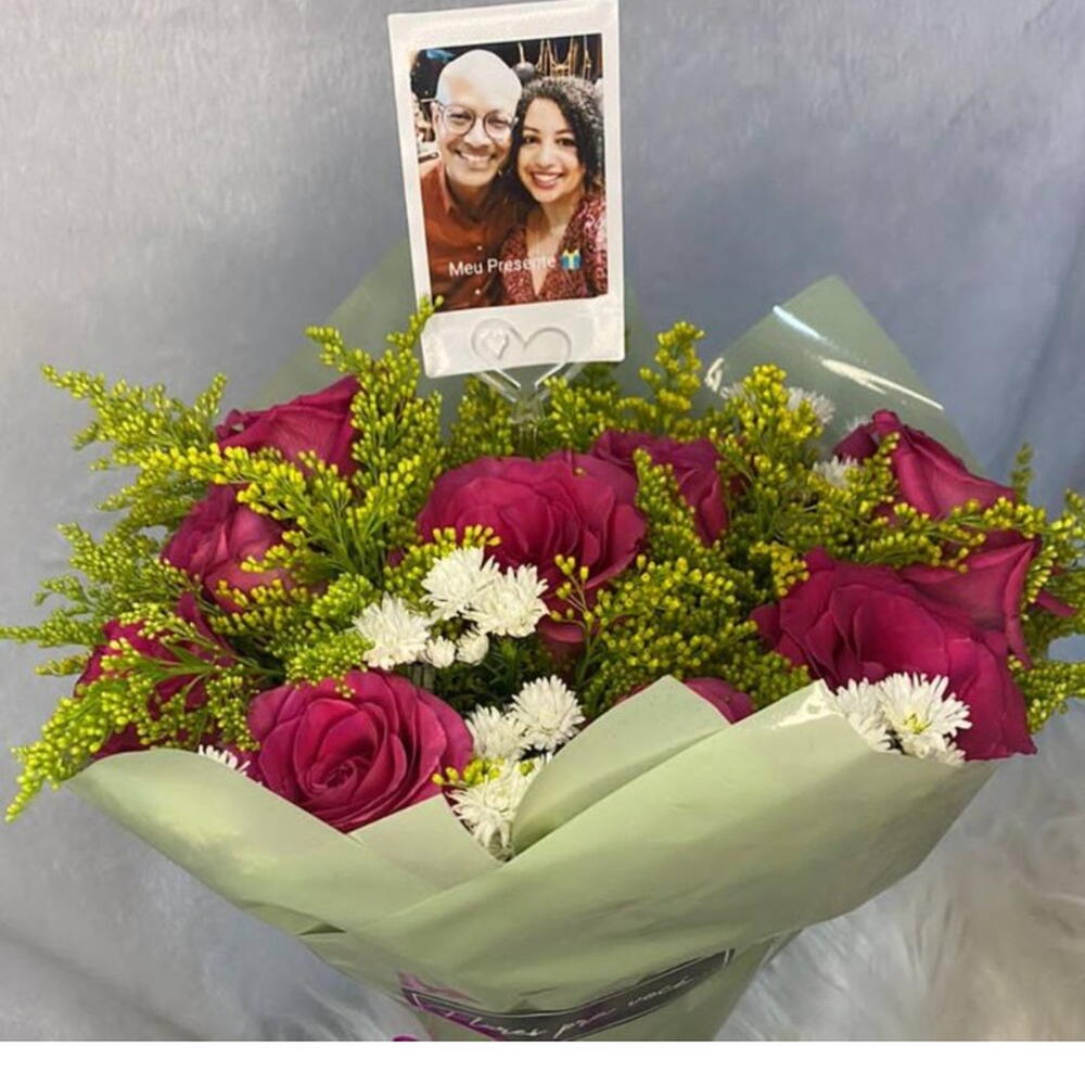 Favor enviar a foto no chat. O Buquê Carinho foi pensado para surpreender a pessoa amada, são 10 rosas Pink ou Cor de Rosa Claro mais folhagem, e claro, a foto personalizada. É sucesso total!