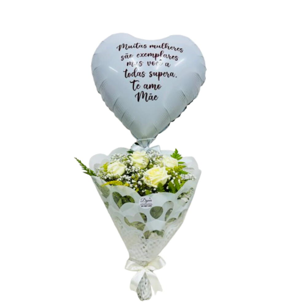 Este kit de presente é composto por 4 belas rosas brancas, cuidadosamente escolhidas para transmitir sentimentos de pureza e carinho. O conjunto é complementado com um conjunto de folhagens variadas, conferindo ao buquê um aspecto fresco e natural. Aninhado em uma embalagem elegante, este presente intrigante é ainda mais atraente graças ao laço delicadamente amarrado ao redor. Para ocasiões especiais, um encantador balão em forma de coração é incluído no kit, acrescentando um toque de paixão a esse gesto de amor.