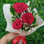 rosa - 3 un. embalagem - 1 un. laço de cetim - 1 un. folhagens - 2 un. egypsophila - 1 un.
