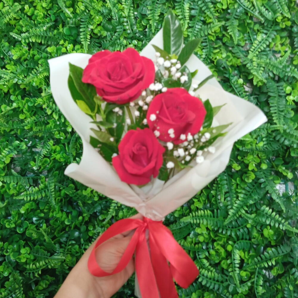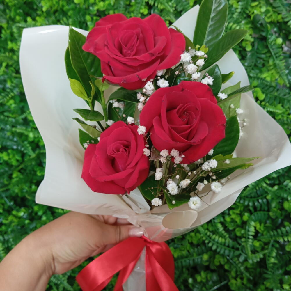 rosa - 3 un. embalagem - 1 un. laço de cetim - 1 un. folhagens - 2 un. egypsophila - 1 un.