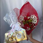 Este presente elegante e sofisticado é composto por três deslumbrantes rosas, realçadas por uma folhagem luxuriosa. Junto, você encontrará uma caixa com oito chocolates Ferrero Rocher, conhecidos pela sua qualidade e sabor inconfundíveis. Tudo vem em uma bela embalagem, delicadamente amarrada com um laço, garantindo uma surpresa encantadora para o sortudo que recebê-la. Este presente com chocolate é certeza de satisfação e encanto para qualquer ocasião.