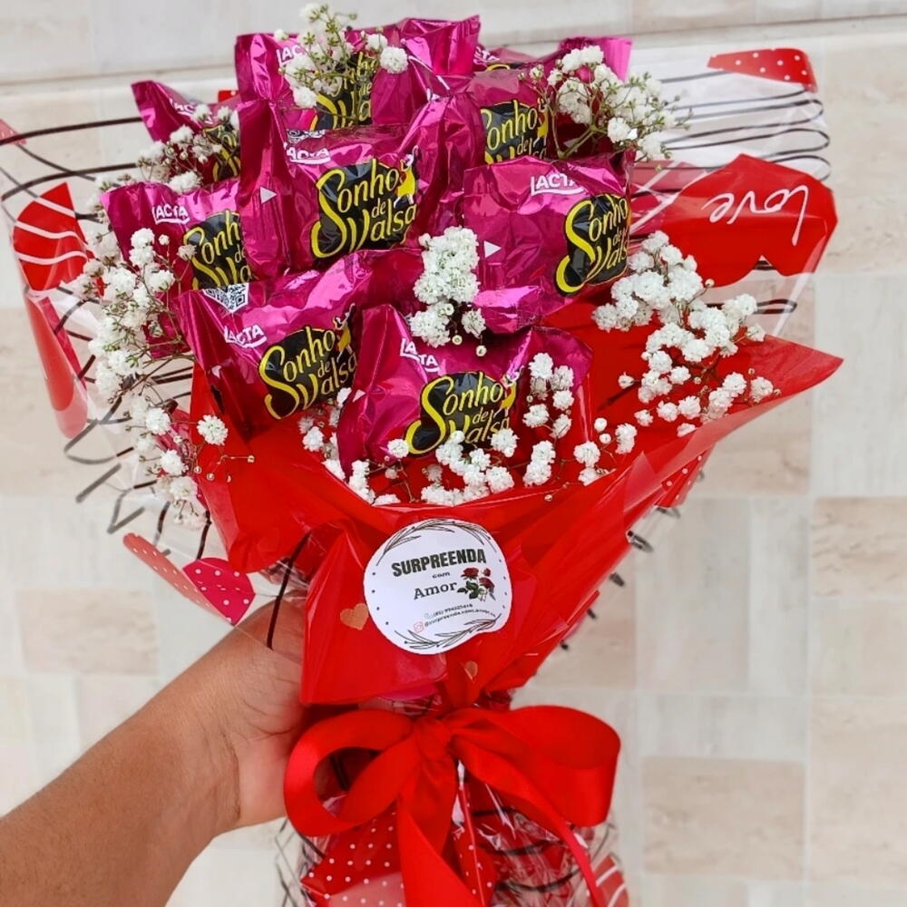 laço - 1 un. chocolates sonho de valsa - 10 un. embalagem linda - 1 un. florzinhas brancas - 7 un.