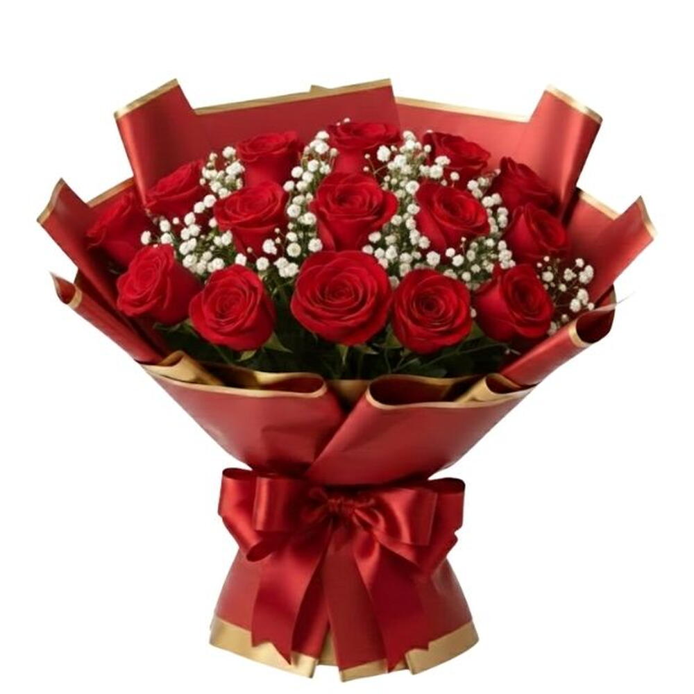 rosa vermelhas frescas e selecionadas - 15 un. galho de gypsophilas - 2 un.