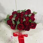 folhagens - 1 un. laço - 1 un. rosa vermelhas - 20 un. embalagem celofane - 1 un.