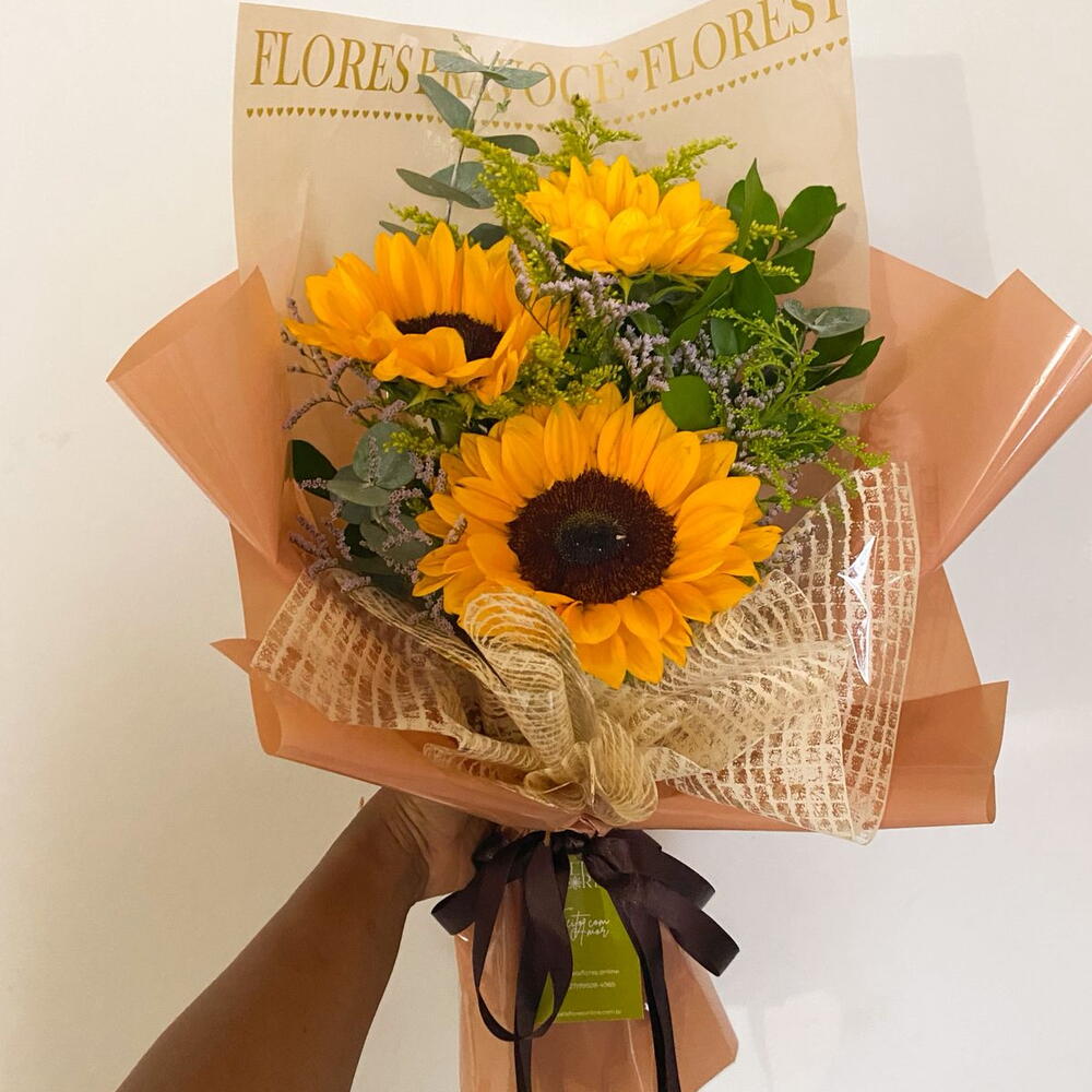 Este buquê cativante é composto por três lindos girassóis, destacados por folhagens bem selecionadas para realçar sua beleza natural. Todos os elementos são cuidadosamente unificados por uma embalagem sofisticada e um laço elegante, tornando-o a escolha perfeita para qualquer ocasião. Adicione um toque de alegria e cor com este buquê marcante.
