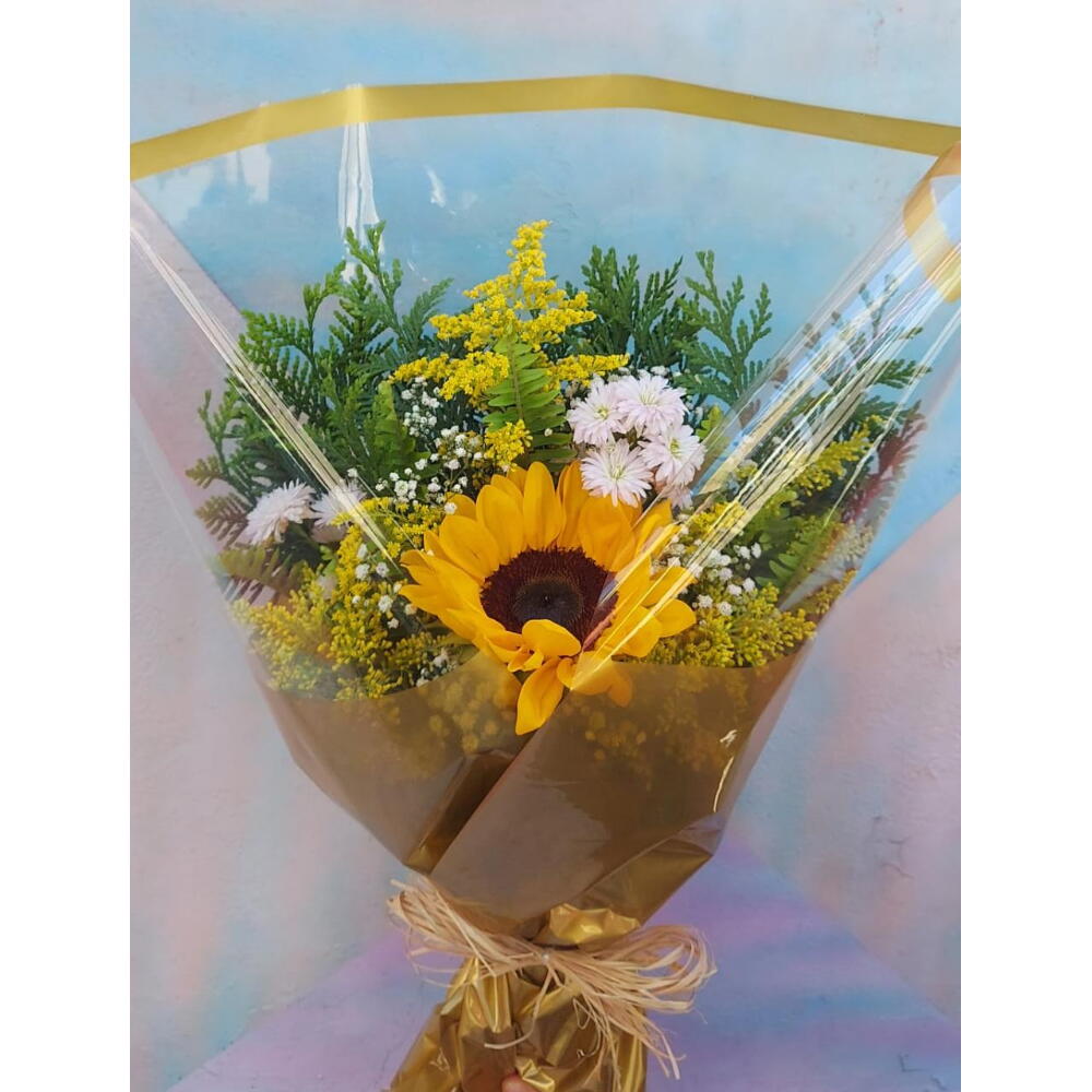 Encante-se com este lindo buquê composto por um vibrante girassol, a estrela desta criação. A beleza natural e exuberante do girassol é complementada por uma seleção cuidadosamente escolhida de folhagens e complementos, que adicionam volume e contraste a este arranjo espetacular. Tudo isso é elegantemente embrulhado em uma embalagem de alta qualidade e finalizado com um laço gracioso. Esta combinação de elementos resulta em um buquê com personalidade e estilo exclusivos, ideal para presentear em qualquer ocasião especial.