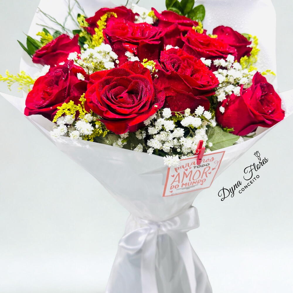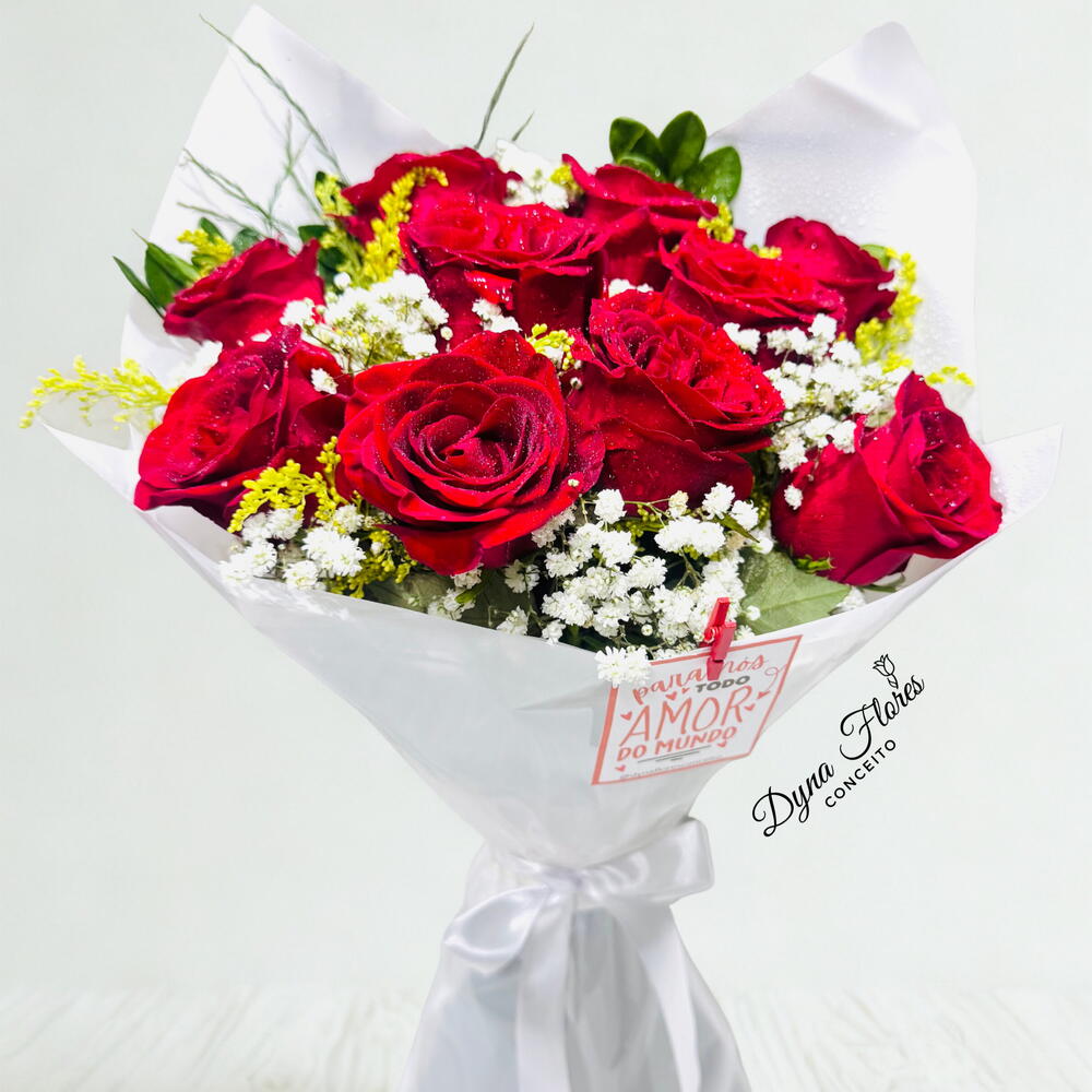 rosa vermelhas - 10 un. folhagem verde - 1 un. embalagem e fita cetim - 1 un. gipsofilas - 1 un. cartão mensagem e tag - 1 un.