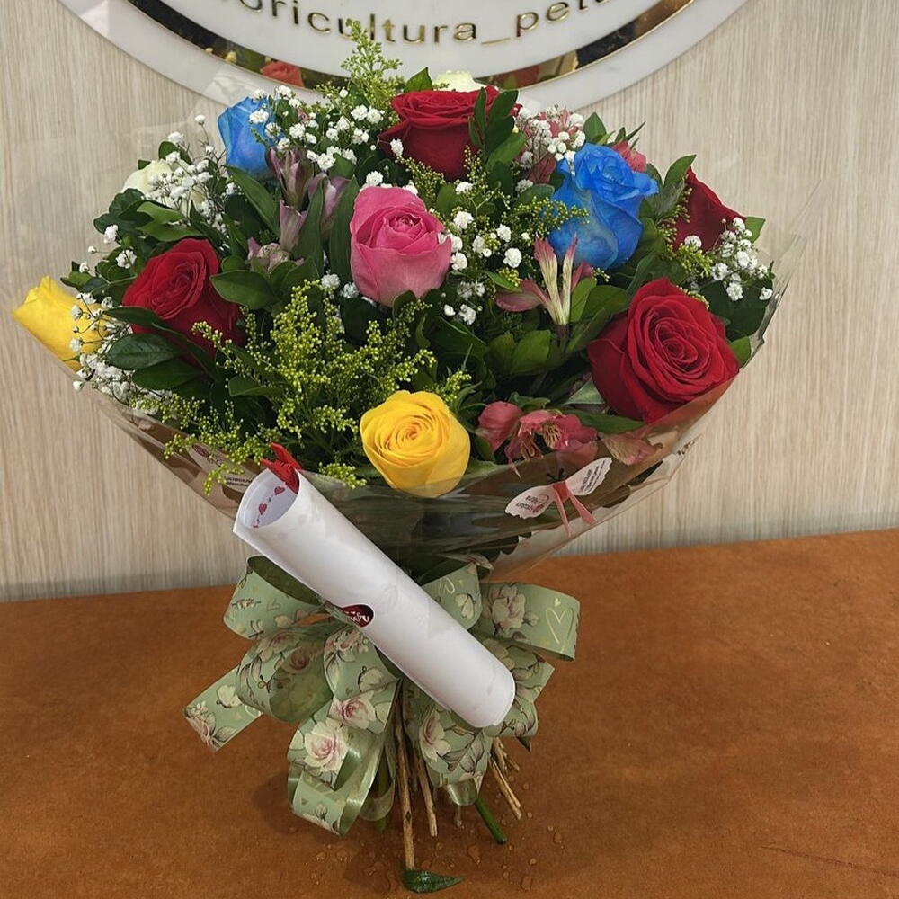 Buquê com 12 Rosas Coloridas com Acabamento