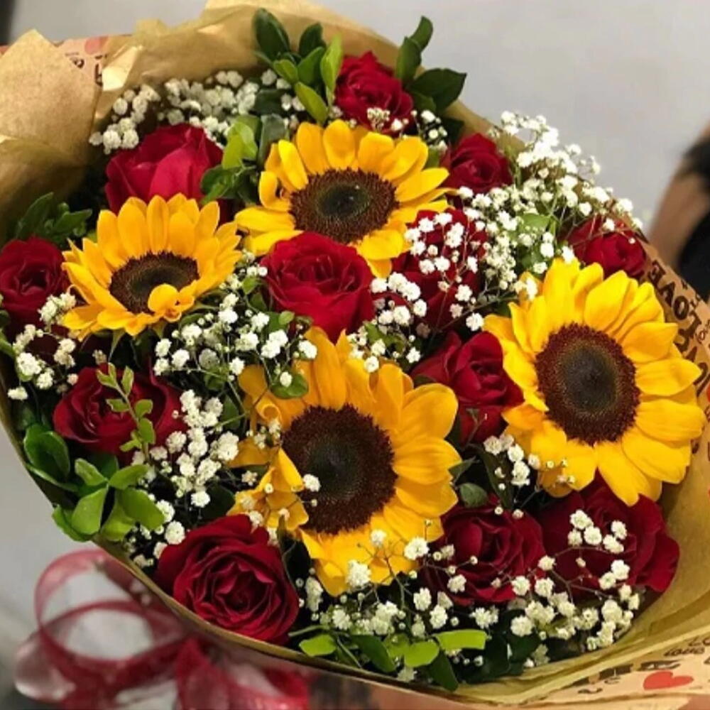 embalagem - 1 un. laço - 1 un. rosa vermelhas - 12 un. girassois - 4 un. folhagens e complementos - 1 un.