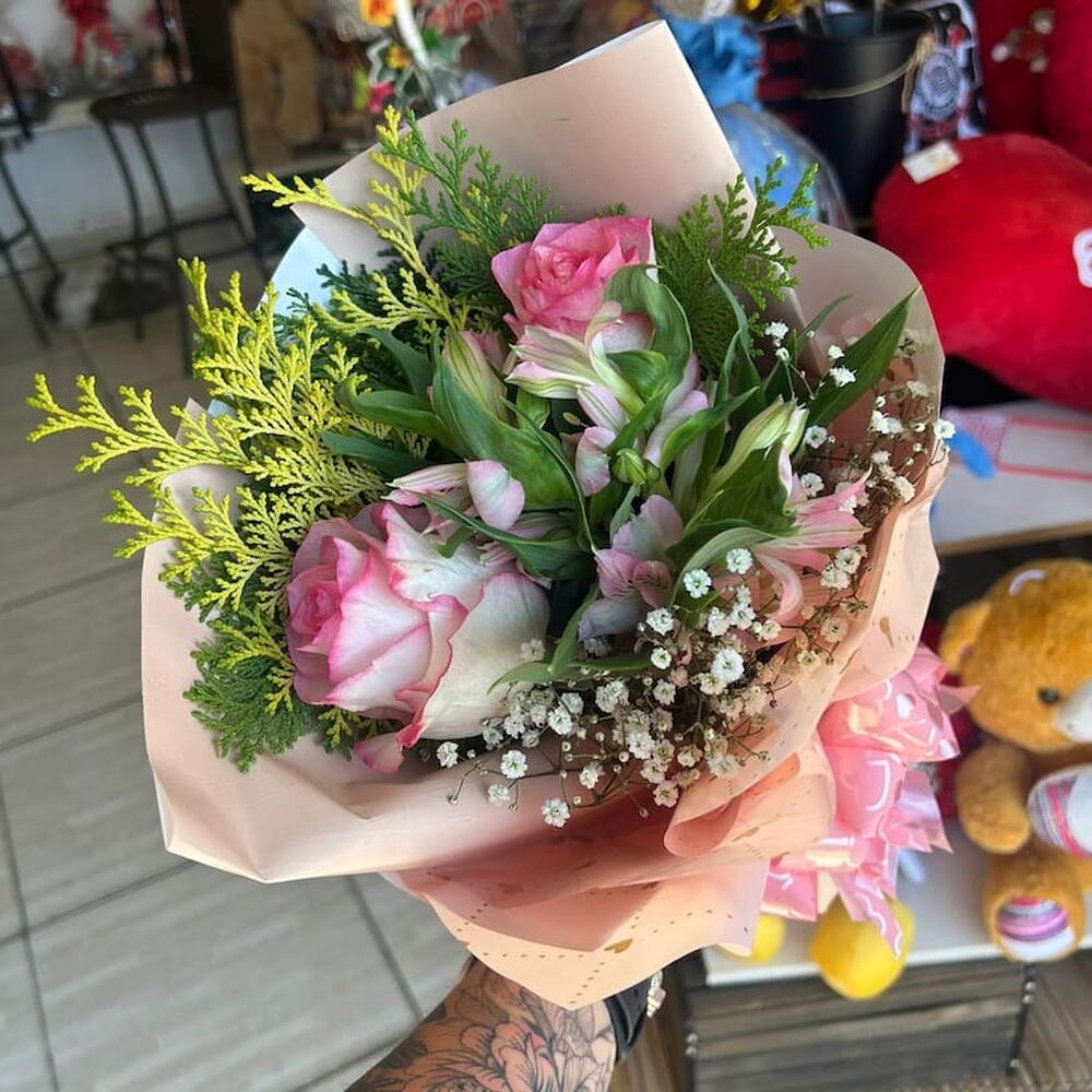 Este buquê charmoso é composto por duas rosas cor-de-rosa, complementadas por folhagens exuberantes. Cuidadosamente embalado em uma unidade de embalagem sofisticada e finalizado com um laço elegante, este buquê é o presente perfeito para expressar seu amor e apreço.