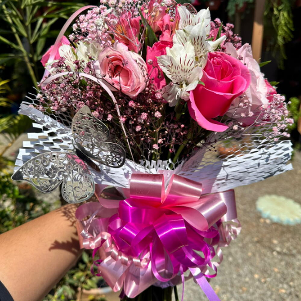 rosa - 20 un. laço - 1 un. astromelias - 1 un. mosquitinhos - 1 un. borboletas - 3 un. embalagem tipo tela - 1 un.