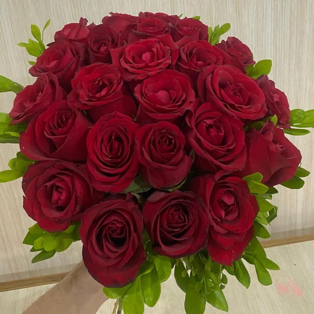 Este elegante buquê é composto por vinte deslumbrantes rosas vermelhas, cuidadosamente arranjadas entre uma luxuriante folhagem. Chega delicadamente embalado e decorado com um laço singular. Um verdadeiro deleite para qualquer ocasião.