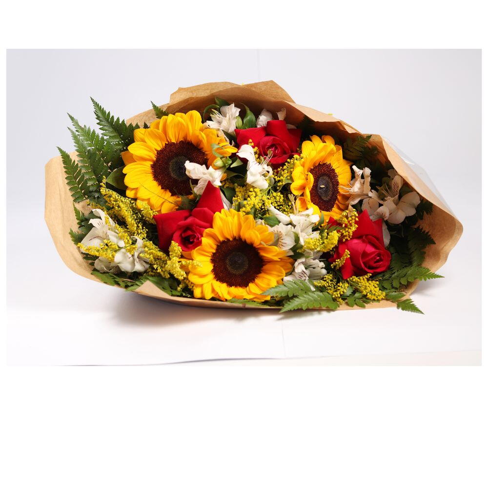 Desperte sorrisos e luz em dias especiais com este alegre buquê composto por 3 vibrantes girassóis e 3 elegantes rosas vermelhas. Esta combinação de cores e formas não só exala beleza, mas também simboliza amor, admiração e positividade. Perfeito para presentear alguém que você gostaria de fazer sorrir.