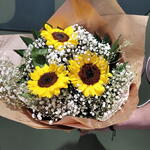 Esse buquê é uma expressão viva e solar, composta por três magníficos girassóis. Suas pétalas amarelas irradiam alegria e otimismo, fazendo dele o presente ideal para iluminar o dia de alguém. Cada girassol foi cuidadosamente selecionado para garantir sua máxima qualidade e frescor. Entregue um raio de sol em forma de buquê para a pessoa especial em sua vida!