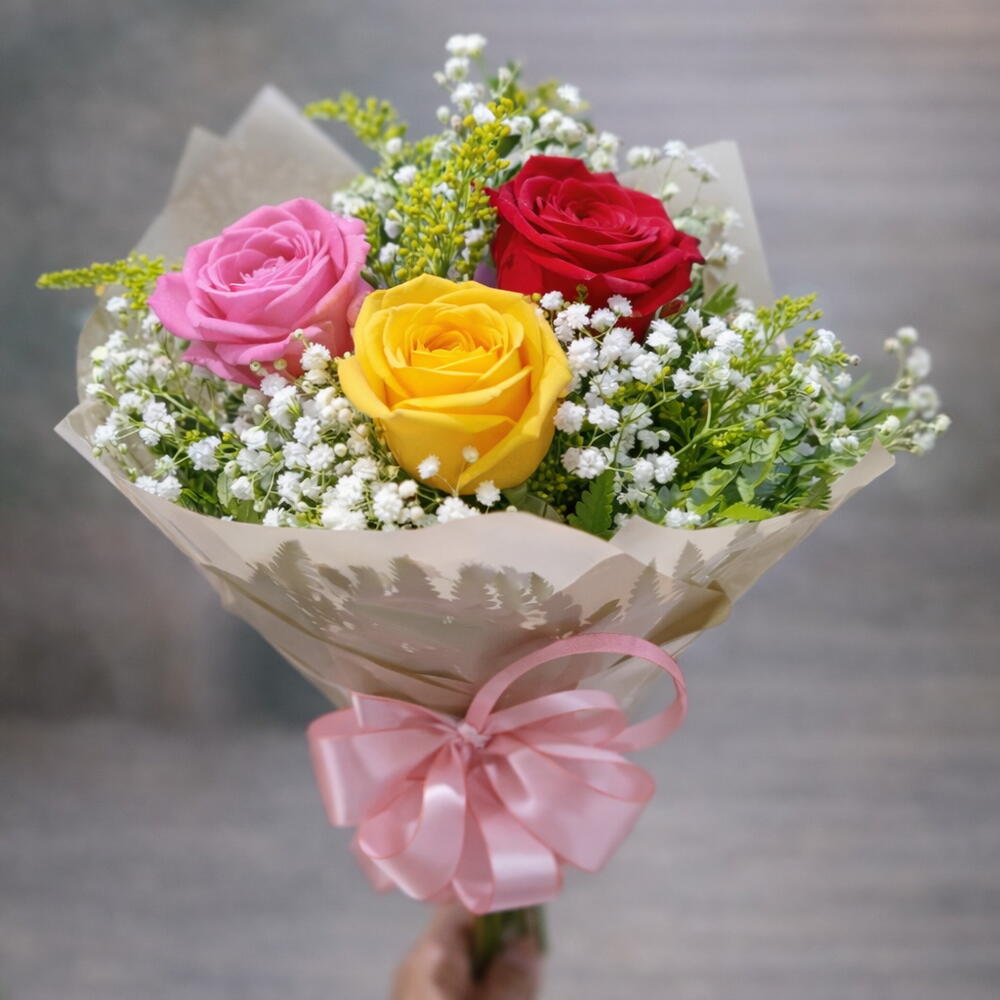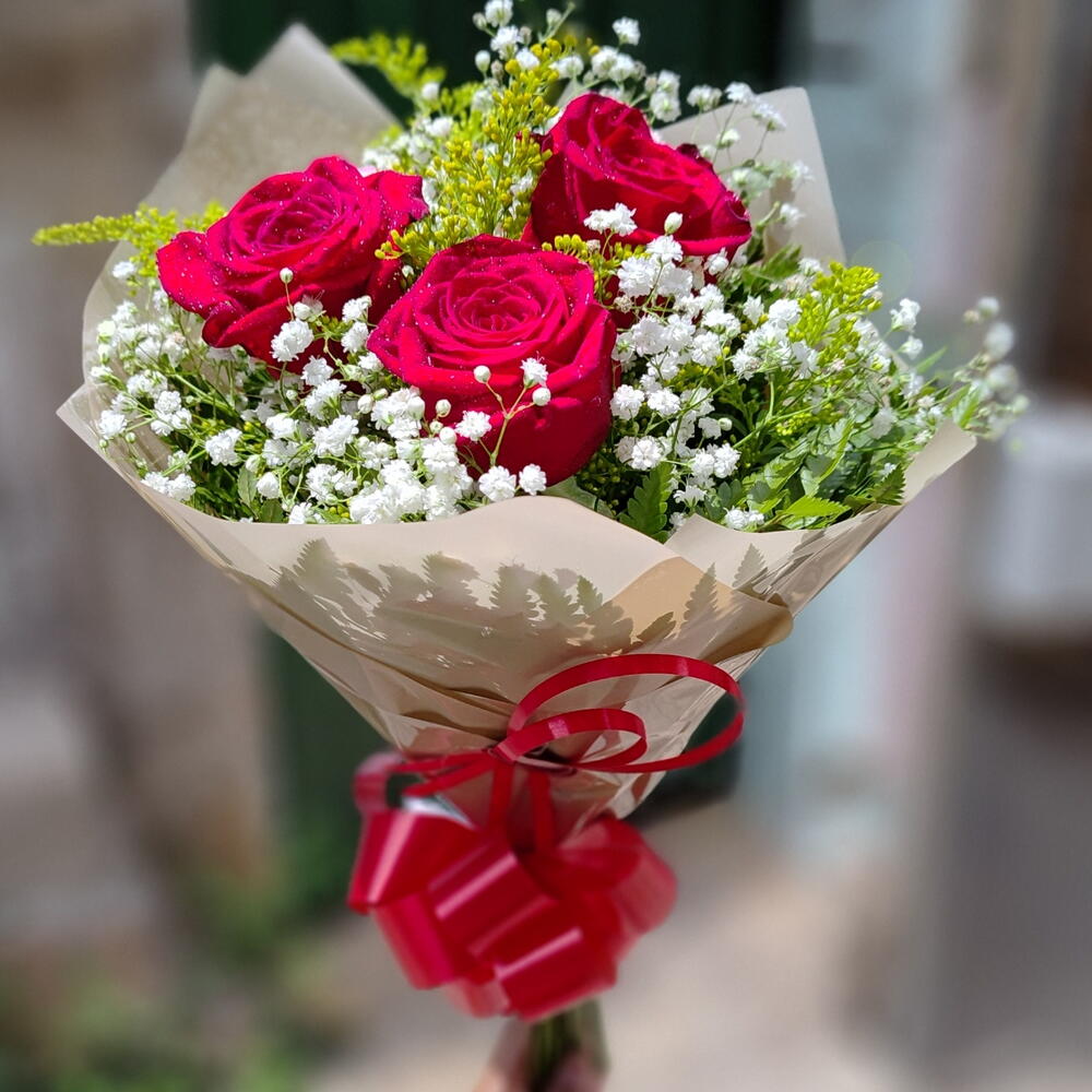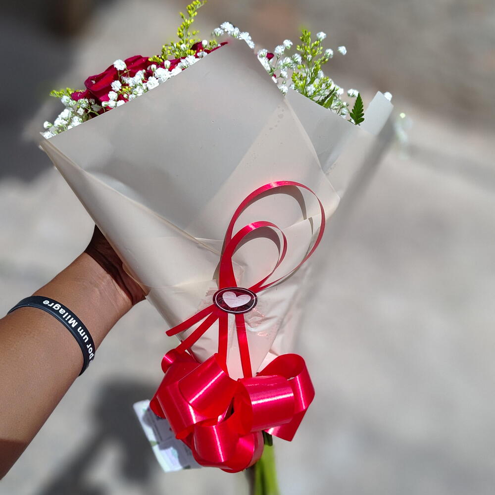 Apresentamos nosso Buquê com 3 Rosas, uma delicada combinação de três rosas vibrantes, complementadas por folhagens exuberantes Gipsofila para adicionar um toque de sofisticação. Cada buquê é cuidadosamente embalado em uma elegante embalagem, finalizada com um laço cativante (medidas aproximadas de 20 cm). Vale ressaltar que a cor da embalagem e dos laços podem variar, sempre de acordo com a disponibilidade, garantindo que cada arranjo seja único e especial.