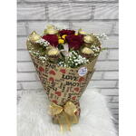 embalagem - 1 un. ferrero rocher - 6 un. laço - 1 un. rosa vermelhas - 3 un. folhagens e complementos - 1 un.