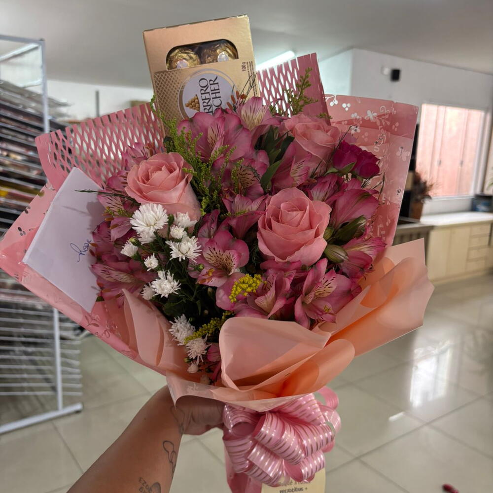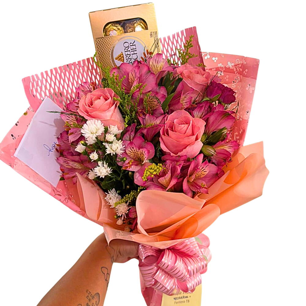 Buquê composto por 3 rosas cor-de-rosa e 8 unidades de Ferrero Rocher. A tonalidade das rosas pode variar conforme disponibilidade em estoque.