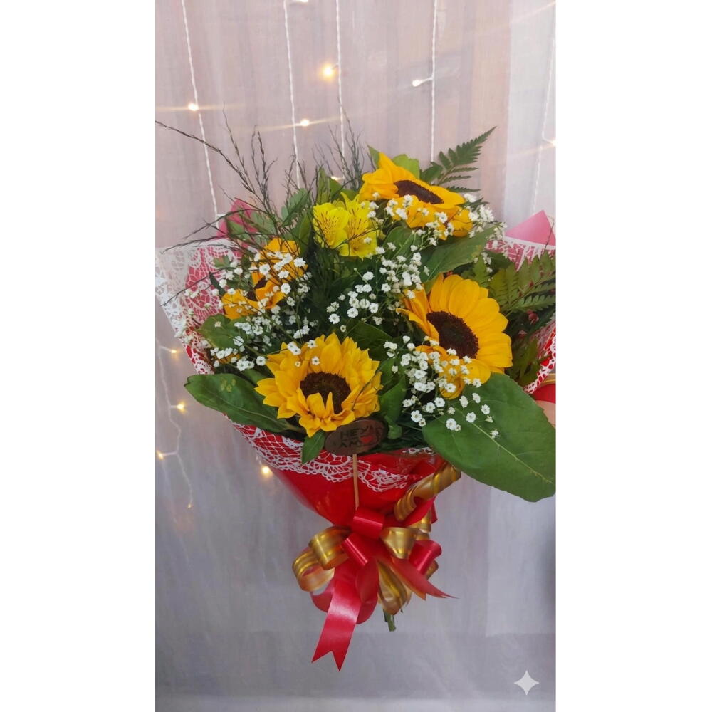 Delicado, alegre e cheio de significado! O buquê com 4 girassóis é a escolha perfeita para transmitir felicidade, energia positiva e carinho em um gesto simples, porém marcante. Com flores vibrantes e cuidadosamente selecionadas, este buquê encanta pela sua beleza natural e charme único.