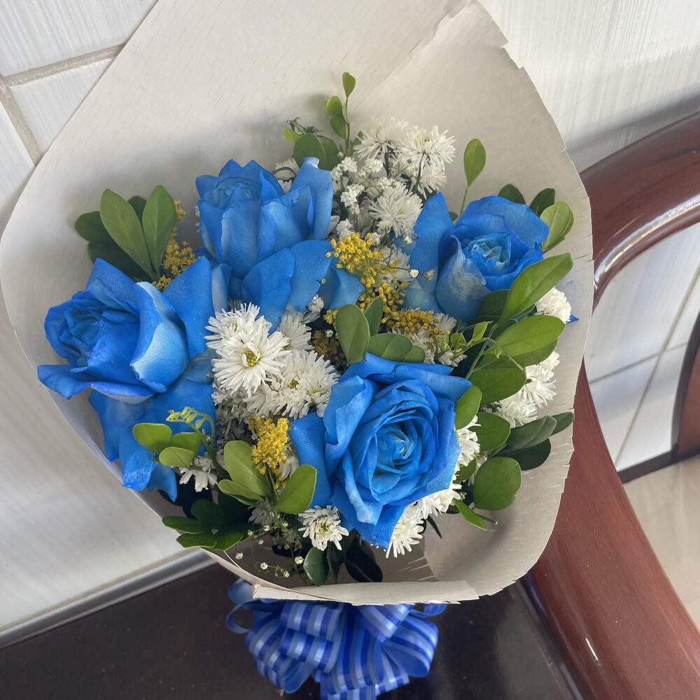 embalagem - 1 un. folhagens - 1 un. laço - 1 un. rosa azuis - 4 un.