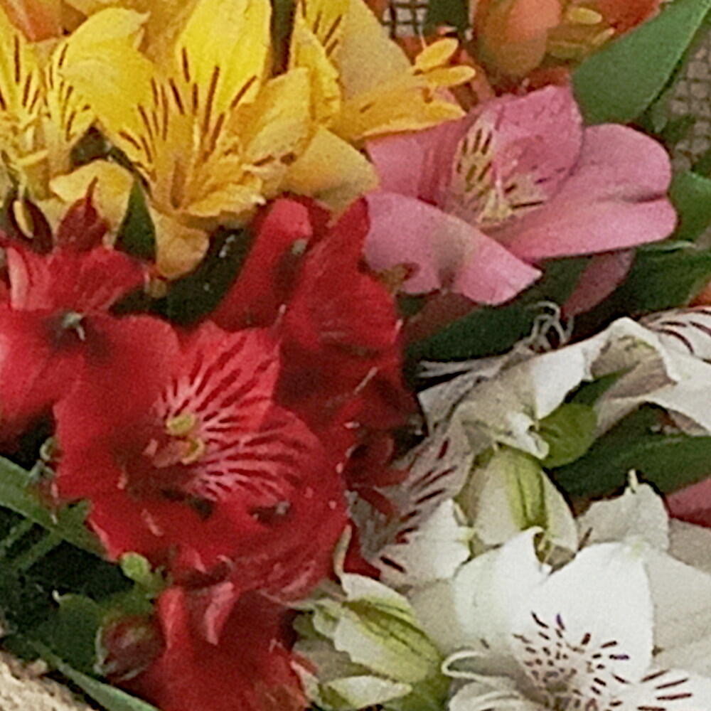 folhagem - 1 un. laço de ráfia - 1 un. alstroemérias coloridas - 5 un. tecido de juta - 1 un.
