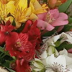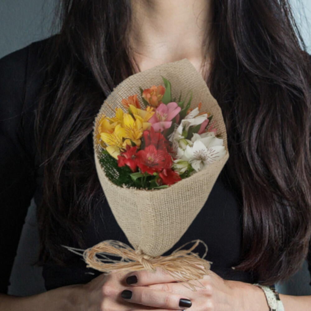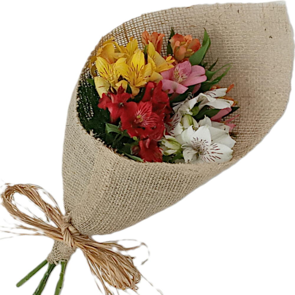 Buquê com 5 hastes de alstroemérias coloridas acompanhado de folhagem e embaladas no tecido de juta com laço de ráfia