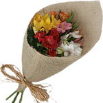 Buquê com 5 hastes de alstroemerias coloridas no tecido de juta