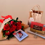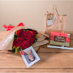 embalagem - 1 un. folhagens - 1 un. chocolate - 1 un. laço - 1 un. rosa vermelhas - 6 un. cartinha - 1 un.