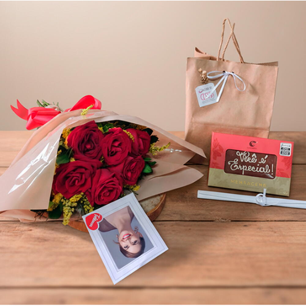 Lindo Buquê com 6 Rosas vermelhas e folhagens naturais, acompanha cartinha com sua mensagem. (editamos sua mensagem em fonte manuscrita, imprimimos sua mensagem em folha ofício, com desenhos de acordo com o tema, enrolamos e fechamos com laço de fita de cetim). O buquê é personalizado com plaquinha com foto gratuitamente (brinde) - não é um porta-retrato. Por trabalhamos, exclusivamente, com flores naturais, elas poderão variar conforme a sazonalidade, desta forma, nenhum buquê será exatamente igual a outro (mesmo que a florista e o fornecedor seja o mesmo) 1 Doce Mensagem de chocolate- Cia do Cacau (45g) barra de chocolate preto, escrito em chocolate branco: você é especial. A embalagem do buquê poderá mudar de acordo com a disponibilidade do mercado. *Verifique a disponibilidade no dia da entrega, antes de realizar seu pedido.