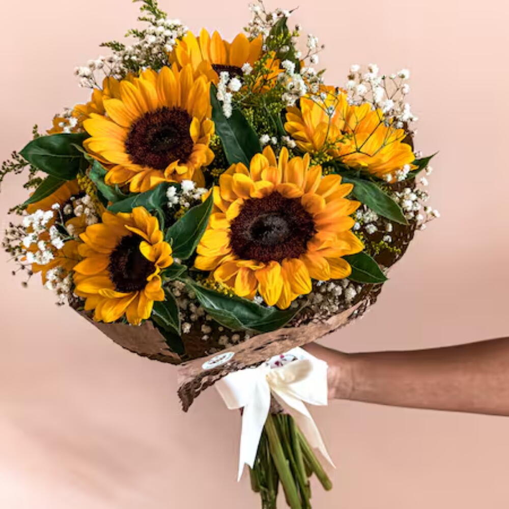 Este é um deslumbrante buquê de girassóis, composto por oito unidade dessas flores vibrantes e alegres, bem como folhagens e complementos que realçam ainda mais sua beleza. Acompanha uma embalagem prática e elegante para proteger e acomodar adequadamente o arranjo. Além disso, inclui um laço charmoso para adicionar um toque final de sofisticação. Este buquê é a maneira perfeita de expressar seus sentimentos em qualquer ocasião.