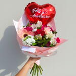 Este lindo presente é a combinação perfeita de doçura e elegância. Contêm uma rosa vermelha sedutora, acompanhada de dois chocolates deliciosos. Também inclui duas gerberas vibrantes e três austromelias para aprimorar a sua oferta. A tudo isso adicionamos um balão em formato de coração que exprime seus sentimentos mais profundos e tudo é habilmente embalado com um laço especial. É o presente perfeito para expressar seu amor ou sua amizade.