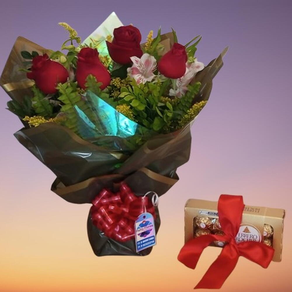 Este presente elegante reúne a indulgência requintada de 8 bombons Ferrero Rocher, a simplicidade delicada de 4 rosas e a vibração natural de 1 unidade de folhagens. Tudo cuidadosamente embalado numa sofisticada embalagem decorada com um laço. Uma verdadeira celebração dos sentidos, este é o presente perfeito para tornar qualquer ocasião mais especial.