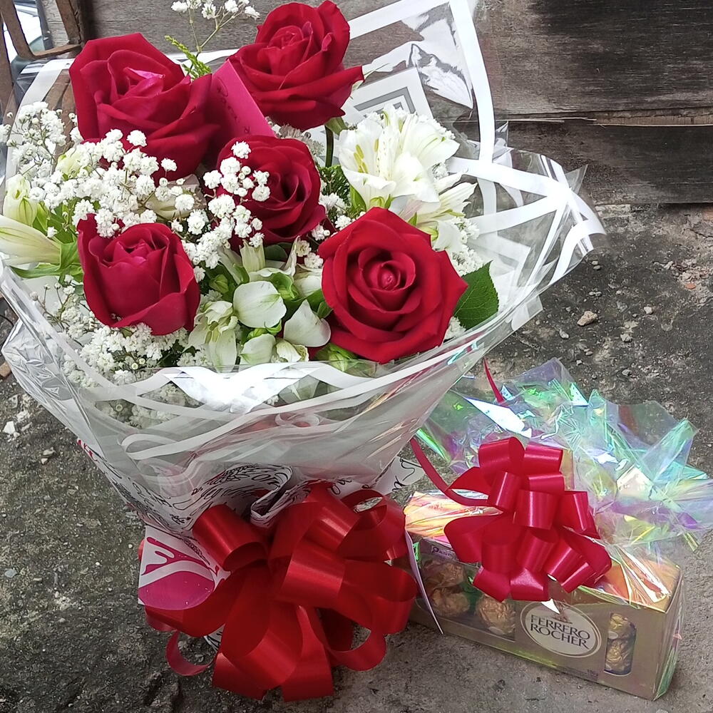 rosa - 4 un. embalagem - 1 un. folhagens - 1 un. laço - 1 un. ferrero rocher com 8 bombons - 1 un.
