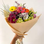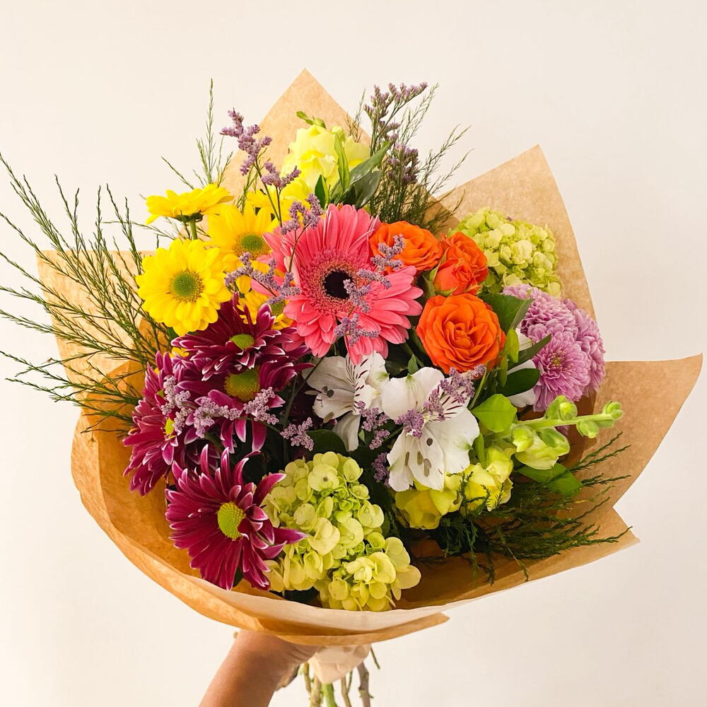flores diversas - 10 un. laço em cetim - 1 un. embalagem moderna - 1 un.