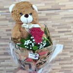 Este encantador buquê é composto por duas deslumbrantes rosas vermelhas, perfeitamente complementadas por uma folhagem fresca. A adição de um fofo urso de pelúcia faz deste um presente realmente especial. O buquê é habilmente embrulhado em celofane e numa charmosa embalagem Kraft, finalizado com um laço refinado para um toque extra de elegância. Surpreenda alguém especial com esta bela combinação.