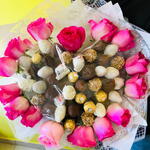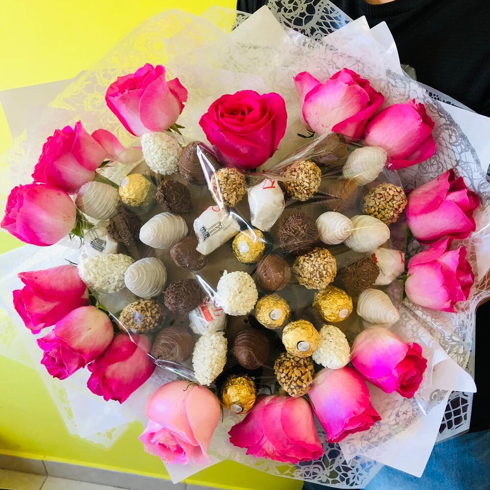 embalagem - 1 un. ferrero rocher - 6 un. laço - 1 un. rafaello - 6 un. morangos com chocolate e confeitos mistos - 30 un. rosa cor de rosa ou vermelha - 20 un.