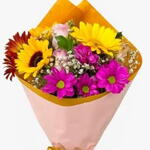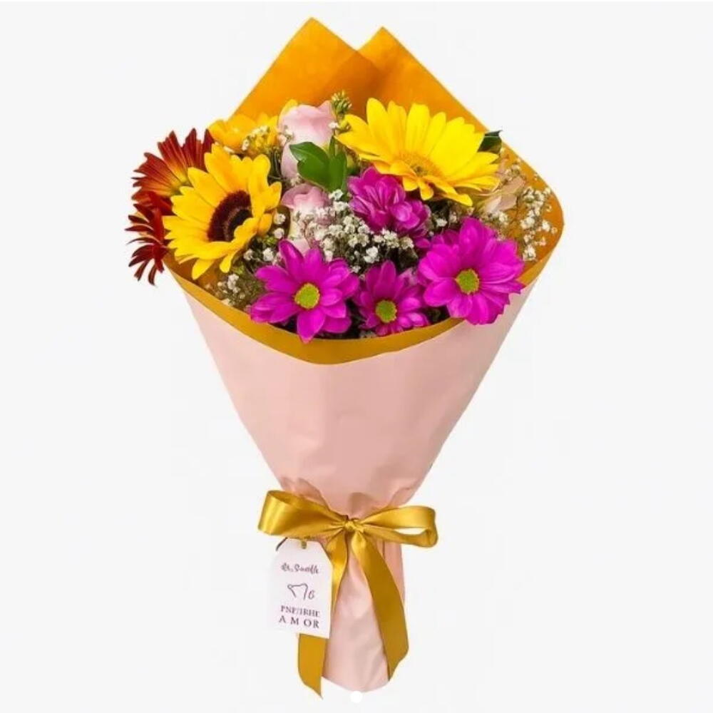 Este buquê de flores útil e fascinante contém um bonito laço, uma embalagem kraft estilizada, um encantador mosquitinho, duas rosas cor de rosa deslumbrantes, um girassol natural vibrante e um maço de margaridas rosadas. Com sua combinação de beleza natural e acabamento artesanal, este produto é perfeito para adicionar um toque de alegria e frescor à casa ou para presentear alguém especial. A beleza radiante do girassol, complementada pelas doces margaridas rosadas e rosas cor de rosa, fazem deste buquê um deleite para os olhos e uma expressão verdadeira de sentimentos adoráveis.