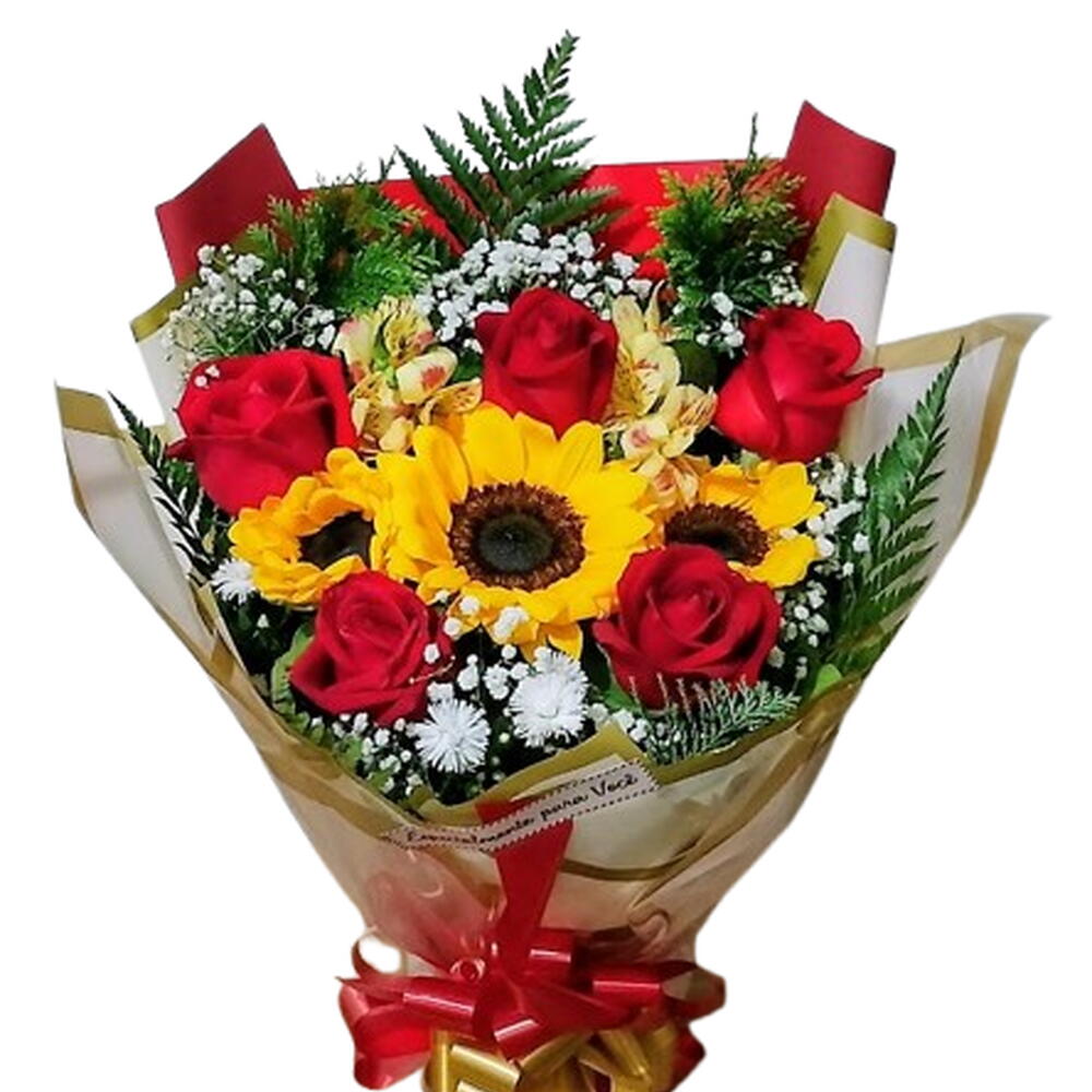 embalagem - 1 un. folhagens - 1 un. girassol - 2 un. laço - 1 un. rosa vermelhas - 4 un.