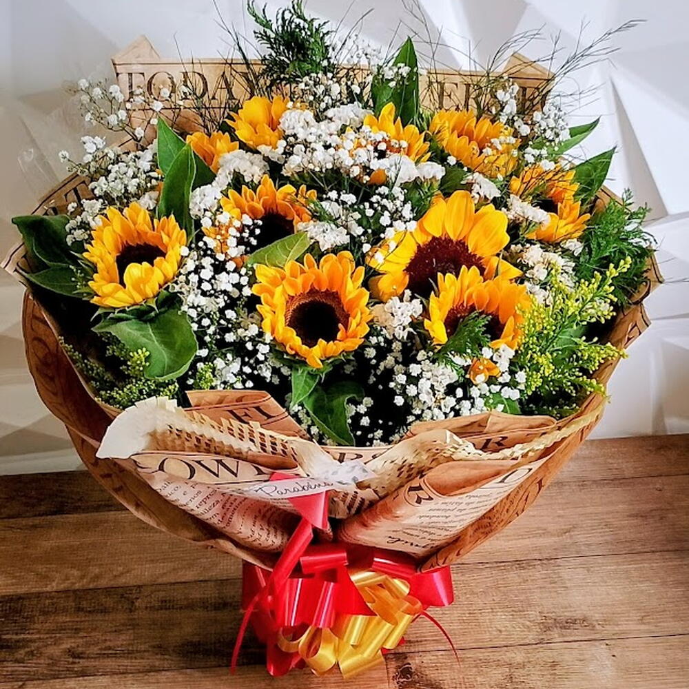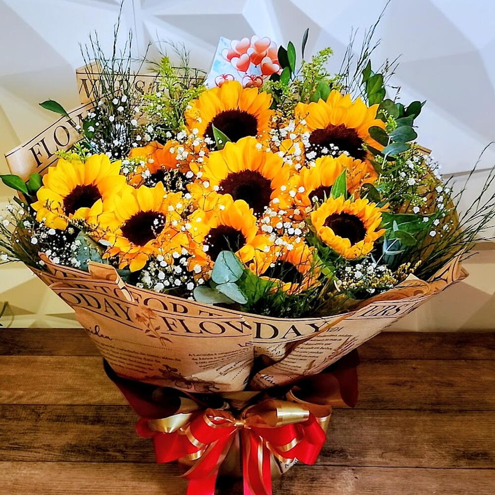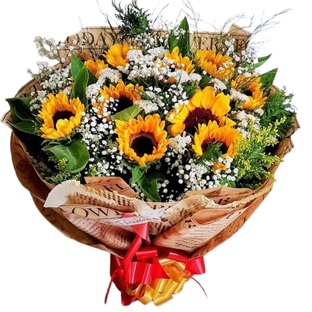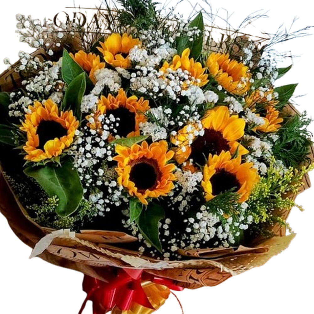 Encante-se com esse exuberante Buquê, constituído por 10 unidades de girassóis vibrantes e radiantes, complementado por uma unidade de gipsonphila ou similar, que adiciona um toque de frescor e delicadeza ao conjunto. O produto vem acompanhado de um complemento (tango/gypsofila) para dar ainda mais vida e cor à composição. Todos estes elementos são cuidadosamente embalados numa elegante embalagem, perfeitamente selada com um laço. Ideal para presentear alguém especial ou decorar o seu espaço com um toque de luz e alegria!