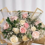Buquê de 14 Rosas Brancas e Rosadas nacionais mistas, folhagens variadas,embalagem e laço. Um buquê que encanta pela delicadeza das cores.