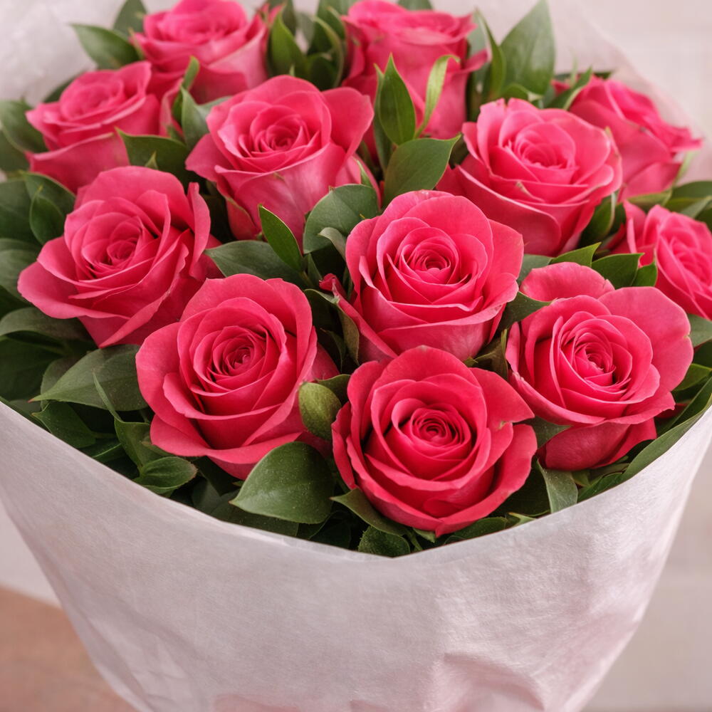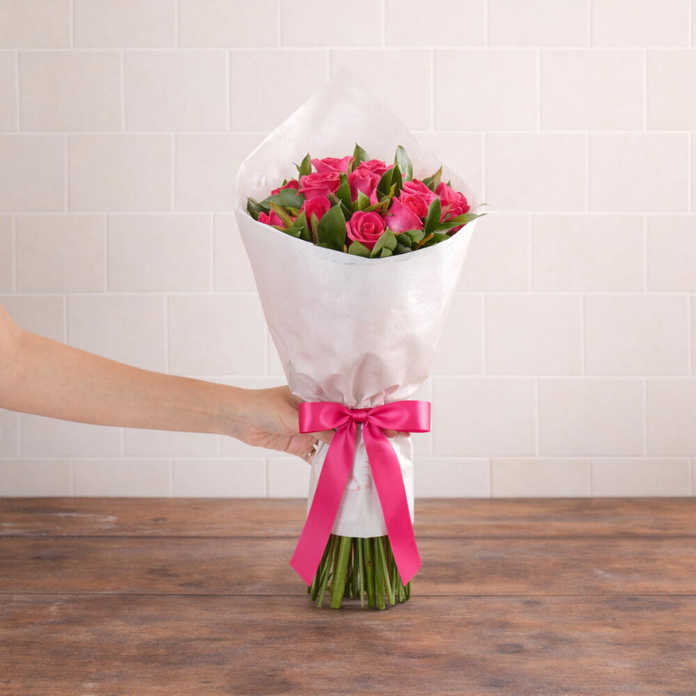 buquê de 12 rosa pink com papel de seda branco e fita de cetim - 12 un.
