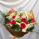 Buquê exuberante com 15 rosas vermelhas nacionais, folhagens variadas, papel crepom premium e laço de cetim. Um presente marcante para momentos inesquecíveis.