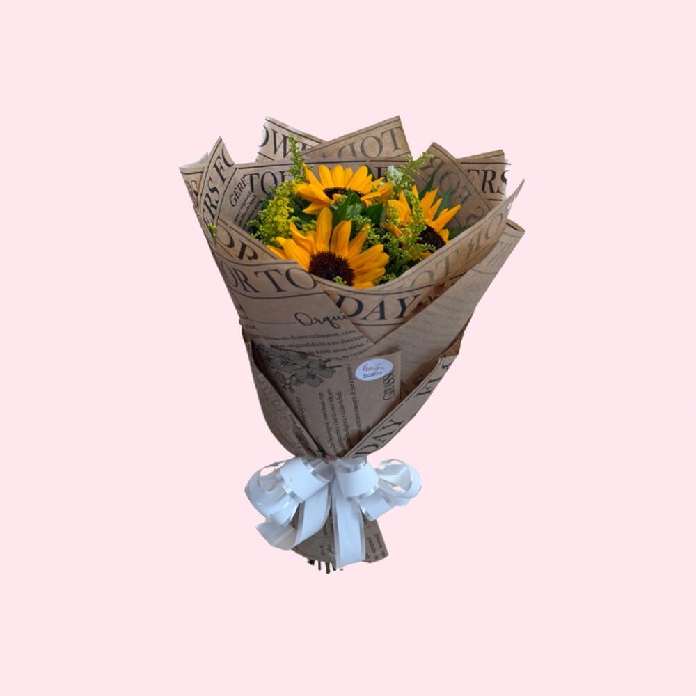 Encante-se com este deslumbrante buquê composto por 3 radiantes girassóis, adornado com 2 hastes de folhagens frescas. Seu brilho dourado e formato energizante são complementados pelas modernas folhagens, criando um arranjo que irradia positividade, alegria e beleza. Ideal para qualquer ocasião especial, este buquê é uma expressão tangível de carinho e admiração.