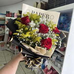 embalagem personalizada - 1 un. gipsofila - 3 un. rosa vermelhas - 4 un. folhagens verdes - 6 un. laço decoração - 1 un.
