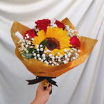 Buquê misto com rosas vermelhas nacionais, 1 girassol natural, folhagens variadas, embalagem e laço. A combinação perfeita de paixão e alegria.