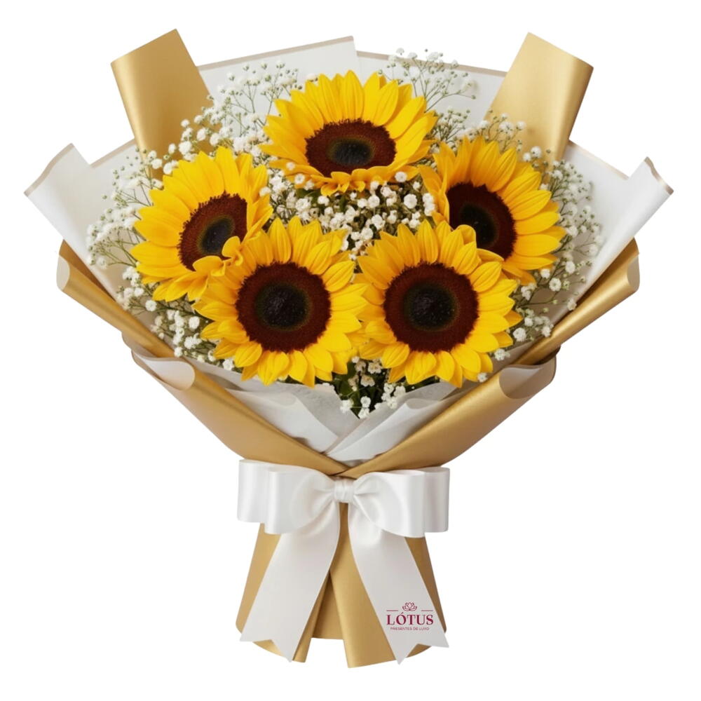 Buquê de 5 Girassois - Depois Que Te Conheci Fui Mais Feliz