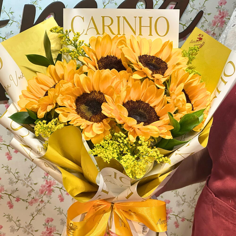 Buquê coreano premium com 6 girassóis frescos e uma caixa Ferrero Rocher 100g (8 unidades). Um presente radiante, sofisticado e cheio de sabor para surpreender com alegria e afeto. Entrega expressa no RJ. 🌻✨🍫