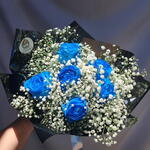 Este elegante e sofisticado buquê apresenta exatamente seis rosas azuis tingidas artisticamente para uma aparência vibrante e única.